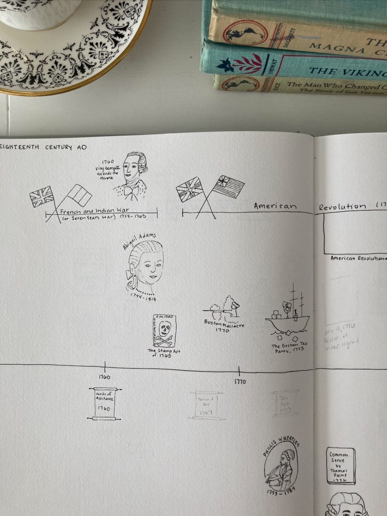 What should you draw? I love seeing what happened when, so I draw books that I’ve read, paintings we’ve studied, as well as scientific discoveries and people we’ve read about. There is also room in the back of the notebooks for maps of differeant areas and from different time periods.