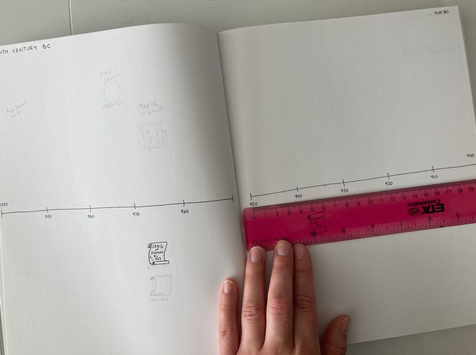 At 1000 BC, each page represnets one century (100 years). So on the top left corner, write 1000 BC and the top right 900 BC. This patterns continue till you reach 100 BC. On that pagespread, I write 100 BC in the top left corner, and then 1 BC in the top right corner. On the next pagespread, I write AD 1 in the top left corner and AD 100 in the top right corner. This each page increases by 100 years until AD 1600.