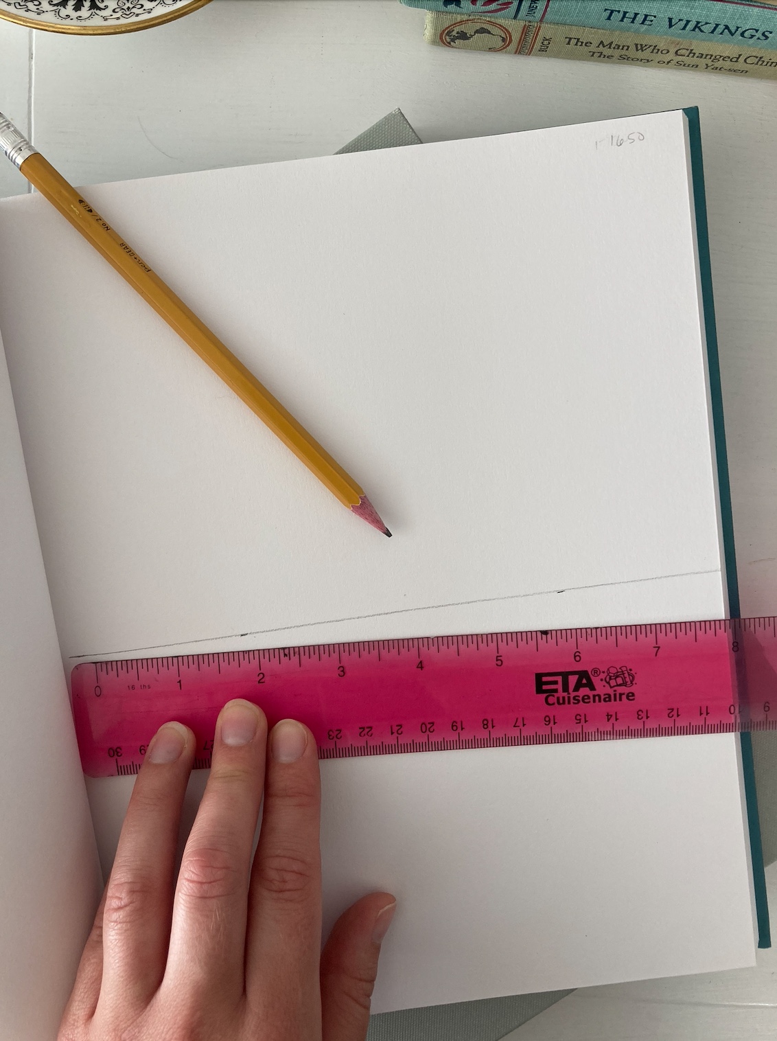 With your ruler, measure 5.5″ from the top of the page, and mark with a pencil in several locations on the page spread.