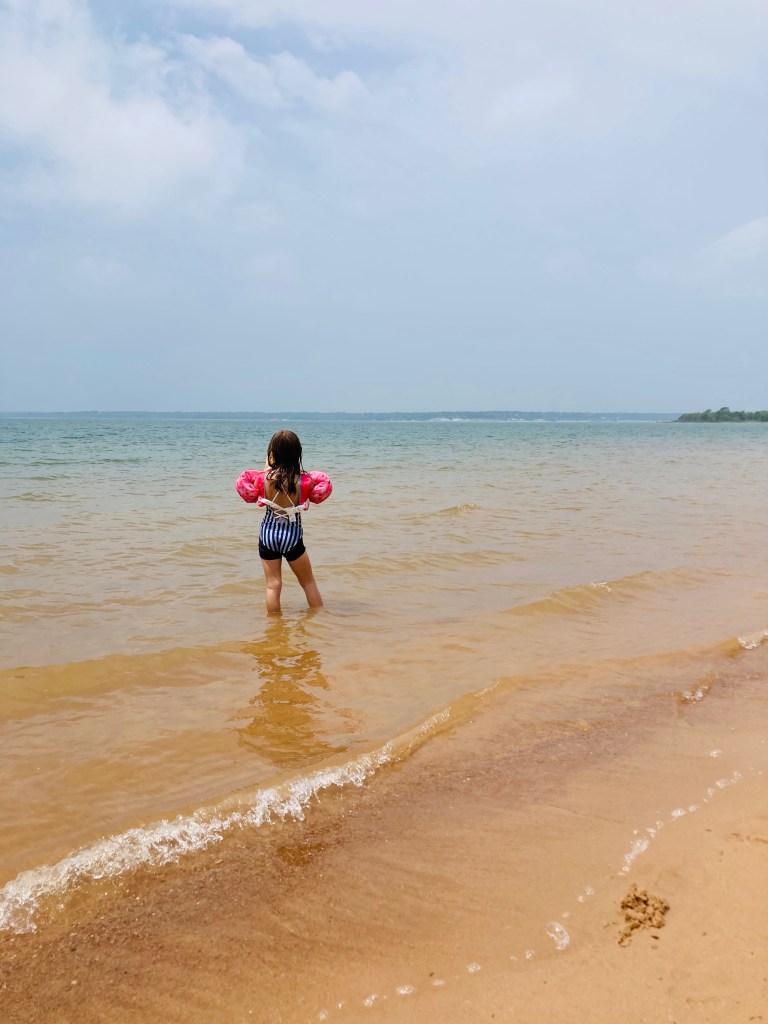 This is a wonderful beach for good swimmers and older kids, as there are small waves from the wind and wake. The swimming area is a long beach with scattered rocks and a sandy clay bottom — I recommend wearing water shoes!
