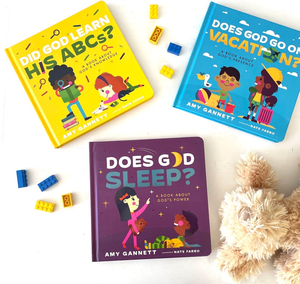 Amy Cate Gannett has written some of the first Christian board books for kids that I actually enjoy, and that teach theological truths about God to kids. She has three board books that she released last year, each covering a different attribute of God: his omnipotence, his omnipresence, and his omniscience.