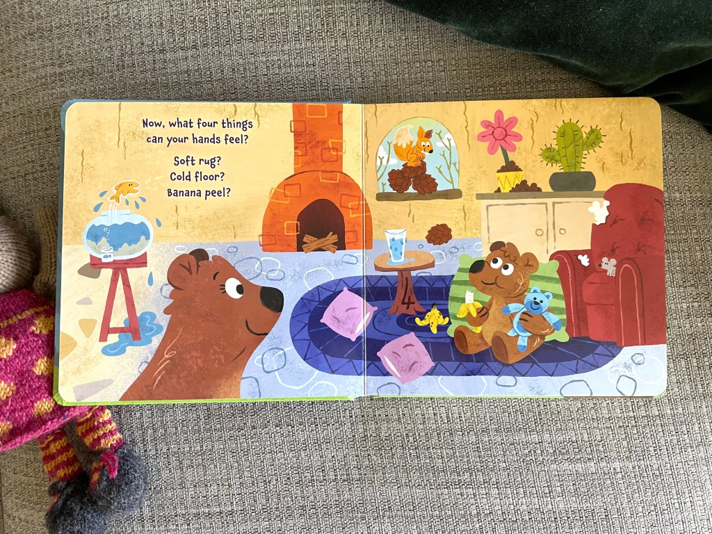 The illustrations are so fun and interactive! After reading a page, my daughter and I would follow the prompts and find the shapes or scents. Then afterwards my daughter asked to “play the game” and practice finding things from all five senses in her bedroom.