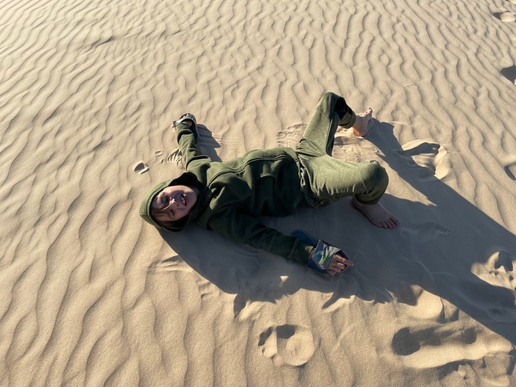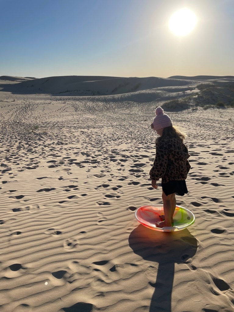 The park ranger said the sand can get extremely hot in the summer months, but the morning came the temperature was in the 50s – almost too cold! You can rent saucer sleds from the park office for around $6 a day. Just keep in mind that you don’t go as fast as you do on snow! They also have a Junior Ranger program, but it is for the round generic Level 1, 2, and 3 pins.