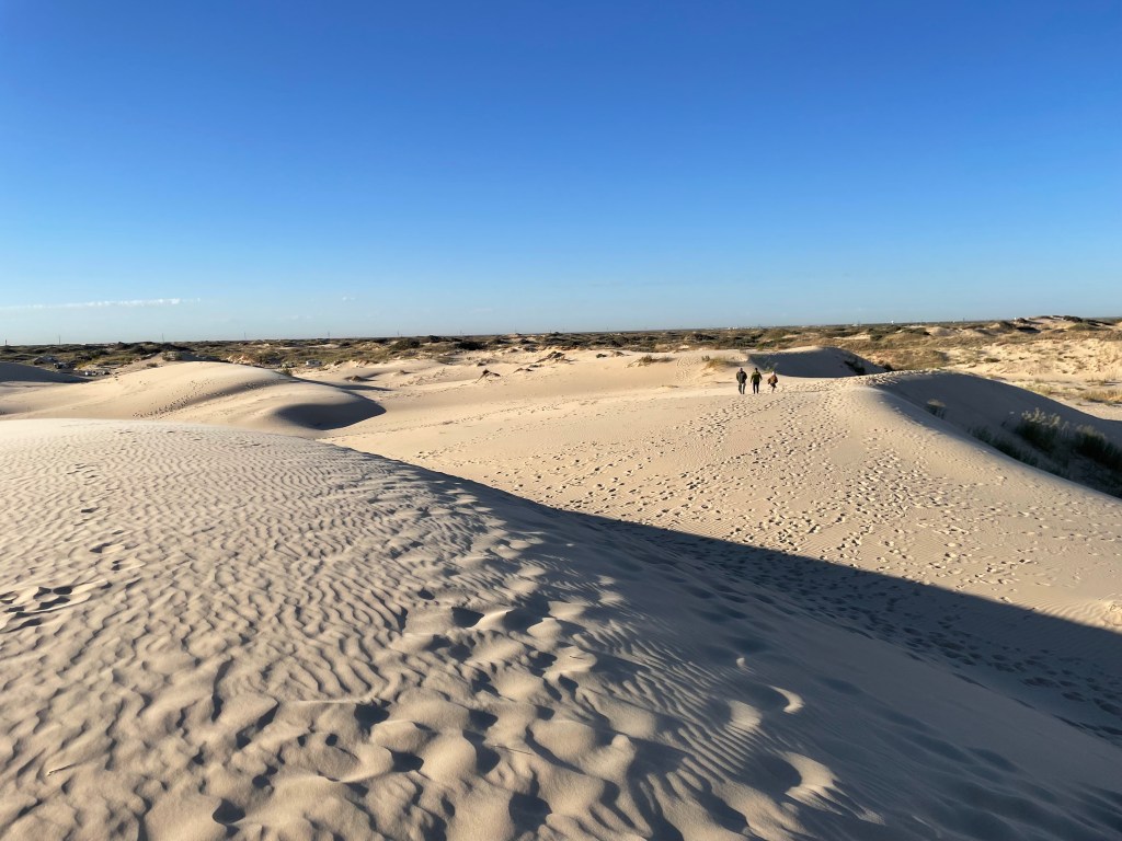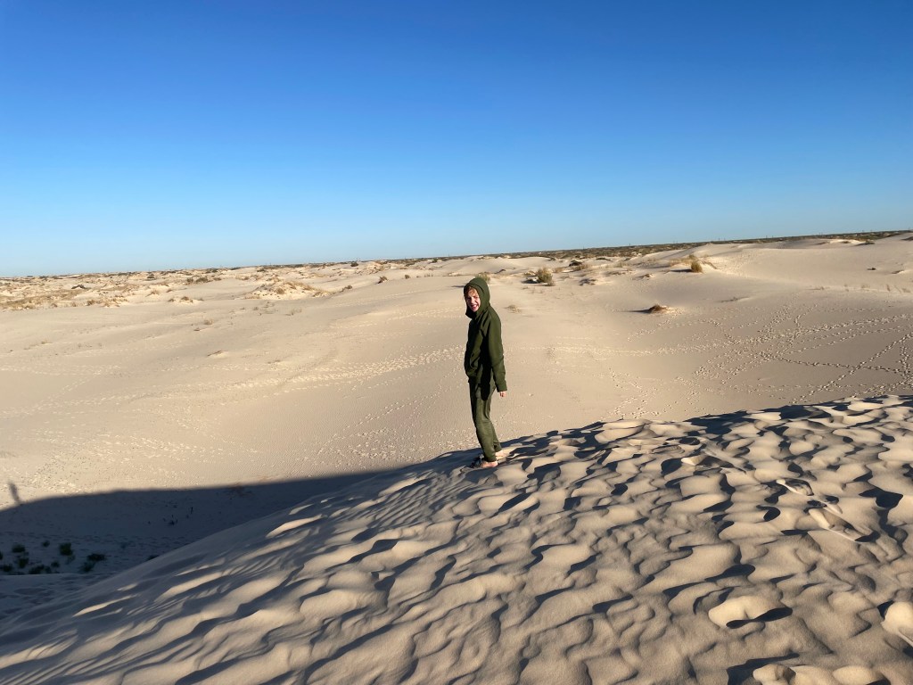 After we checked in, we drove out to the Pump Jack Picnic Area, as the ranger said that’s where the biggest dunes are located. It was stunning! We saw a flock of quail and lots of small animal tracks as we climbed up the sand dunes. After a few times up and down, our legs were tired!