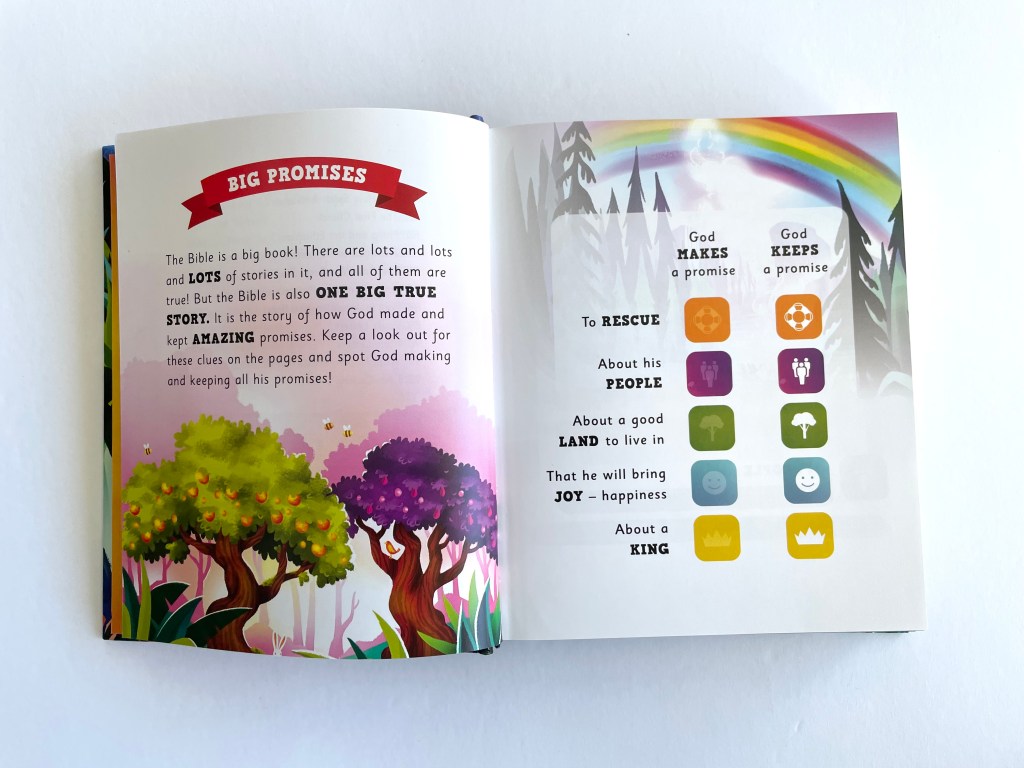 Speckled through the Bible storybook are symbols representing each time that God makes a promise, as well as highlighted symbols sharing when God kept those promises. The different “promise paths” that they follow are: The Rescue Path, The People Path, The Land Path, The Joy Path, and The King Path. What a fun system to help kids make these connections and see that our God is a faithful promise-keeping God.