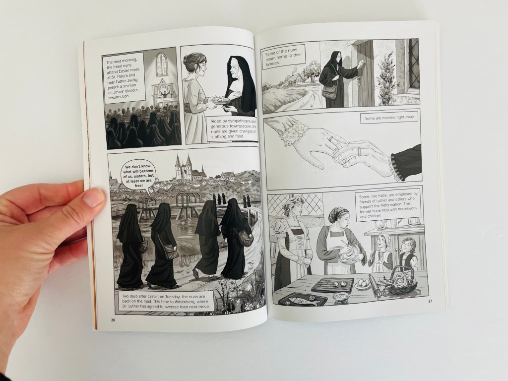 Leigh’s biographical graphic novel on Katie Luther was wonderfully thorough. It covers her life from birth to early childhood in a convent school, to escaping from the convent with the help of Martin Luther. I especially appreciated how it covered her life after her husband, Martin Luther, passed away, and the struggles she faced afterward. It helps put in perspective the difficulties that her family faced during a time of war, and what it cost her to leave the convent and follow Jesus.