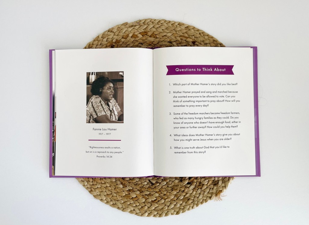 It’s beautiful to hear how Fannie did not turn to hate, but to love despite all of the horrific things that happened to her. Her faith in God helped her to press on with courage and to proclaim biblically based truths to the nation. Fannie Lou Hamer: The Courageous Woman Who Marched for Dignity by K.A. Ellis, is a nice short biography to help kids understand how our nation did not always value human lives in a way that was pleasing to God (or how a biblical worldview can help better a country). It is also inspiring to hear how she chose to do what is right, even when it was hard or came at a great cost.