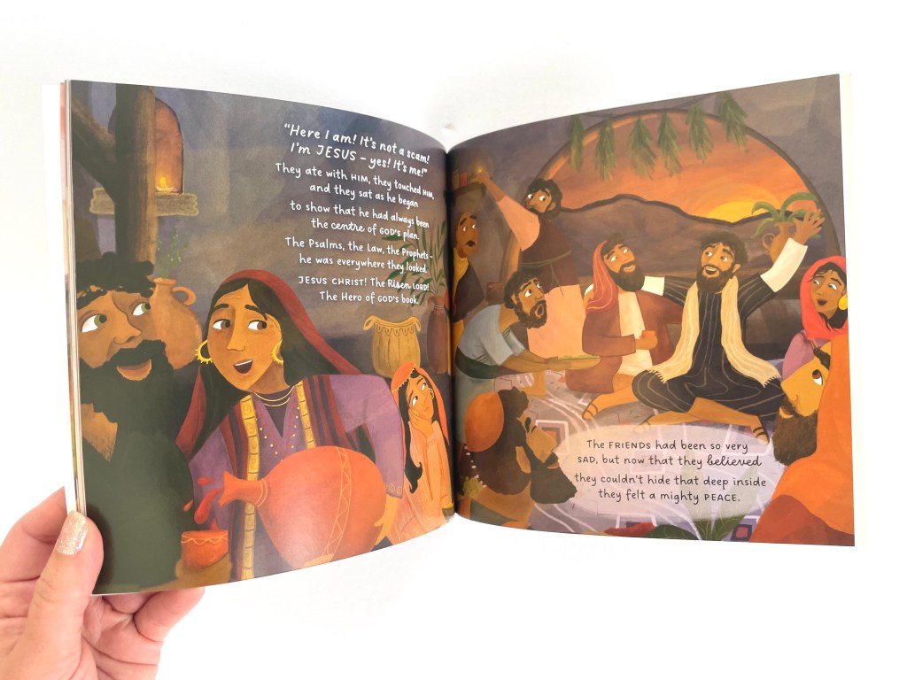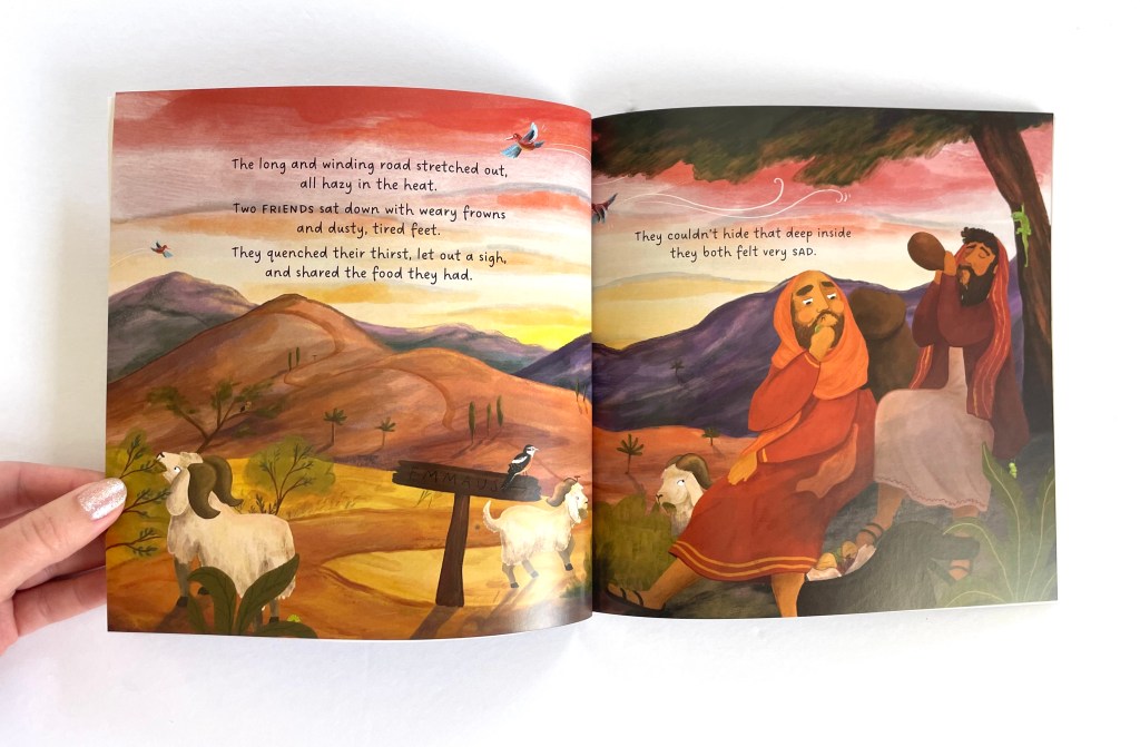 This is such a lovely and delightful Easter book. The Friends and the Traveller by Sam Brewster is a rhyming picture book recounting the lesser-known tale of the men on the road to Emmaus and the stranger, or traveller, they encountered. While this Bible story may not be as popular, the story is so rich, full of truth, and has such a storybook ending!