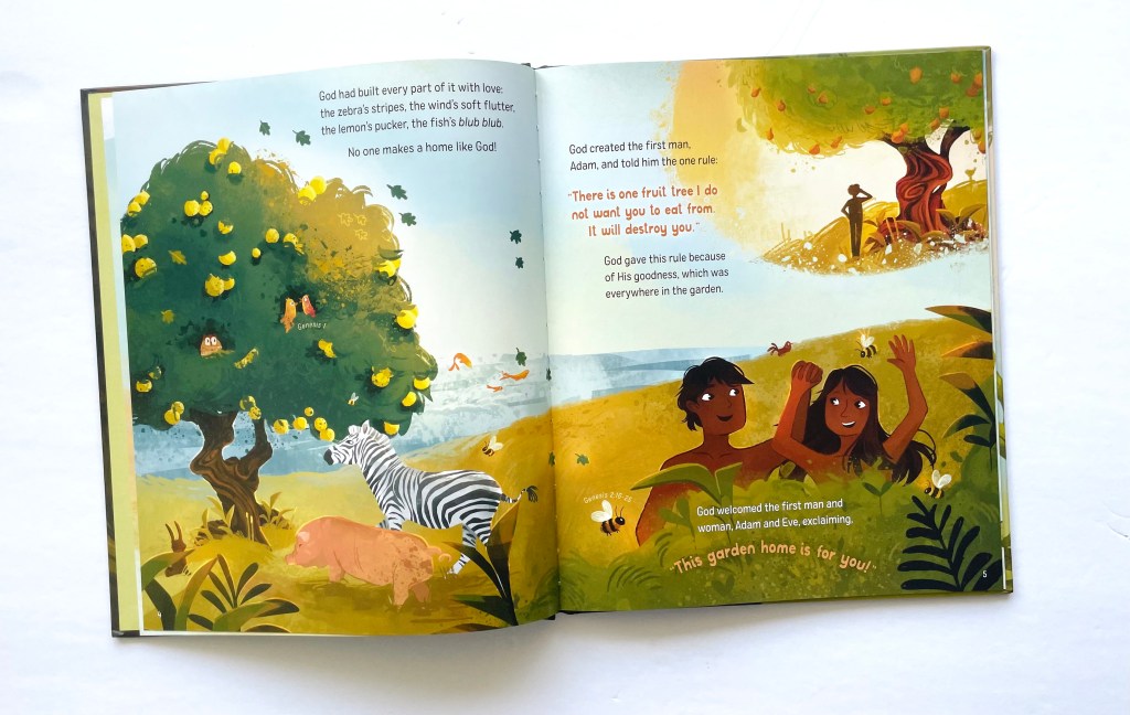 Saunders starts in the Garden of Eden, introducing us to the theme of home, saying, “No one makes a home like God!” She recounts the story of the serpent, of how Adam and Eve had to leave their home, and of people who were so homesick. Saunders does an excellent job at focusing on one theme—and not getting distracted by rabbit trails. This makes it very simple for kids ages 4 – 8 to remember the main message of home.