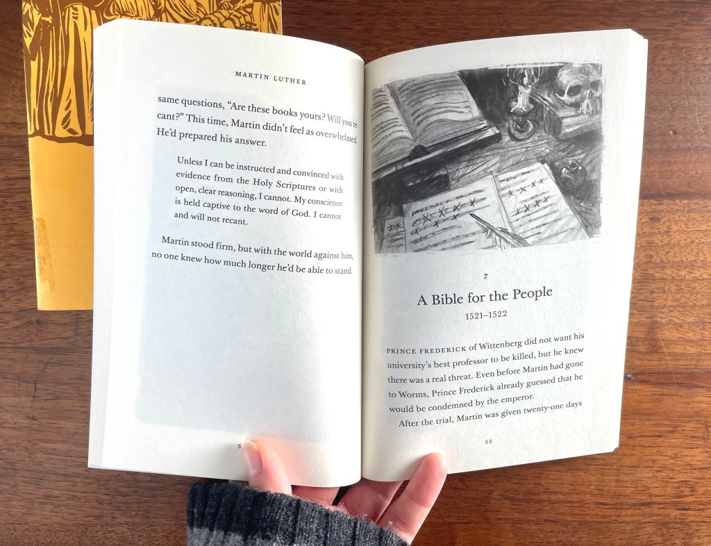 The first chapter begins with a great hook, capturing the reader’s interest and leaving him with the question: Will becoming a monk calm the storm in Luther’s soul? I was a little worried at first that the language would be too easy, as many modern chapter books are, but this biographical chapter book was engaging and informative.