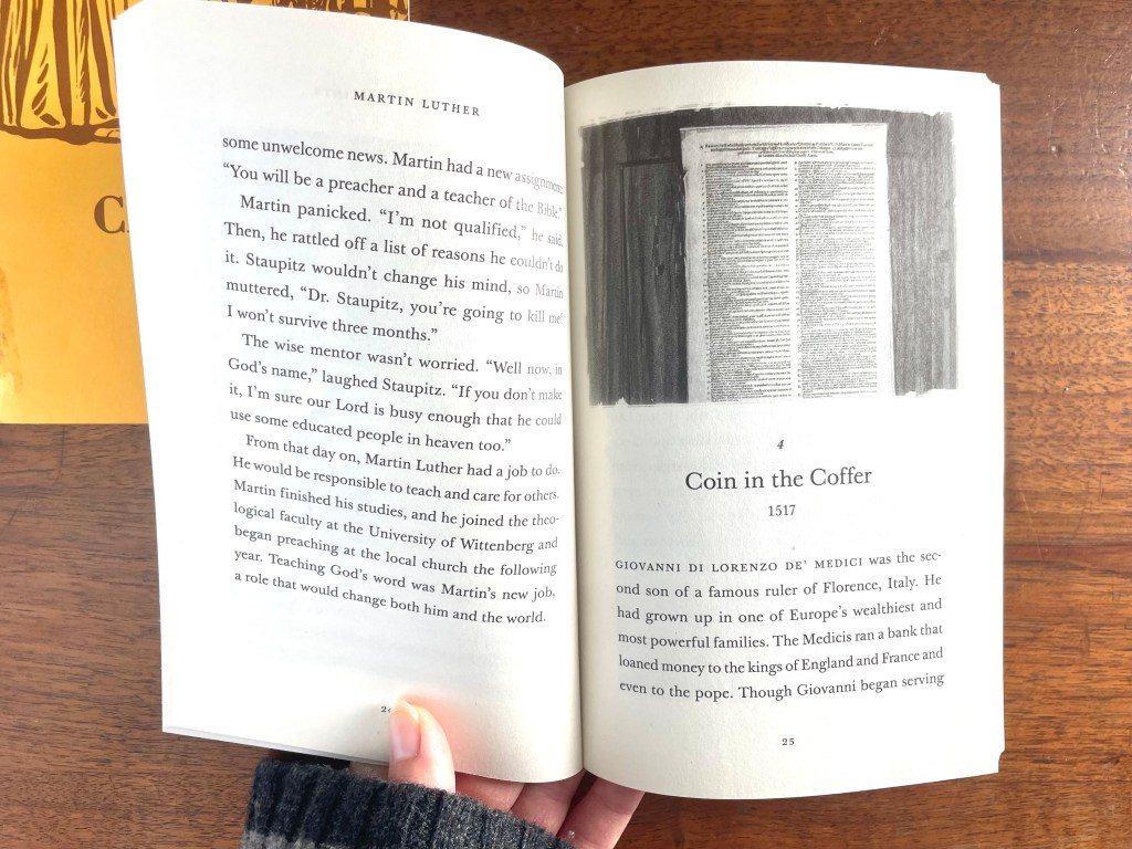 Jared Kennedy, the author of The Beginner’s Gospel Story Bible, does an excellent job of weaving in facts and stories about Luther’s life without feeling like a textbook or the opposite: too flowery. He also clearly and simply shares the different theological beliefs that Luther wrestled with so that young readers can understand the various viewpoints.