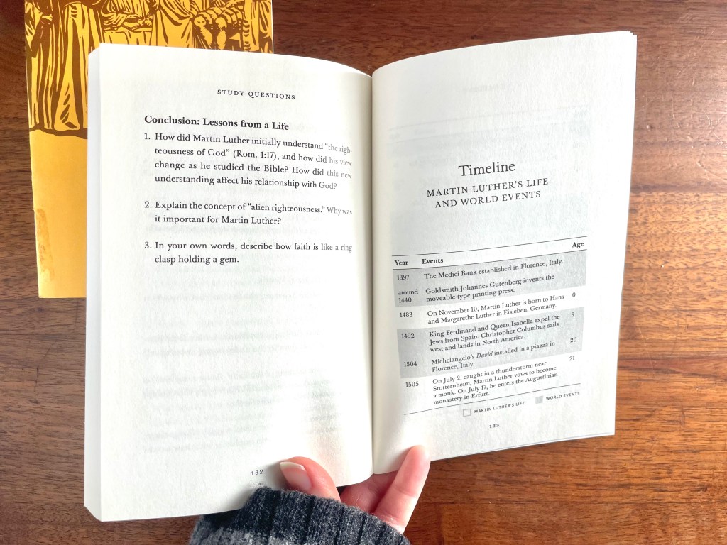 While The Story of Martin Luther by Jared Kennedy looks like a hefty little biography, it contains short chapters, illustrations, and even maps and boxes with fun facts and helpful information inside. For those who want to read this in a class or group setting, there are study questions in the back and a timeline of Luther’s life.