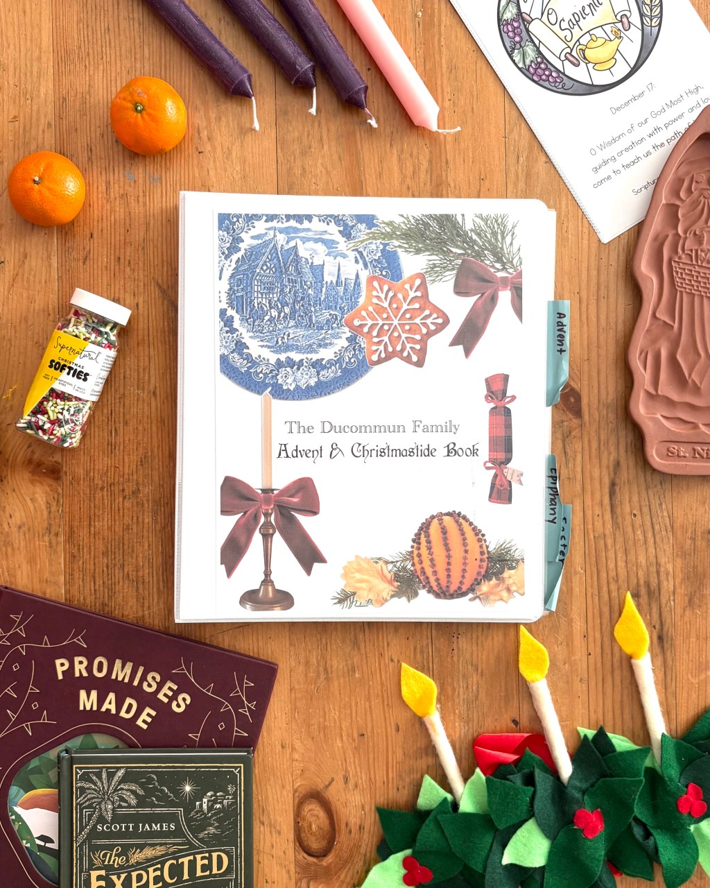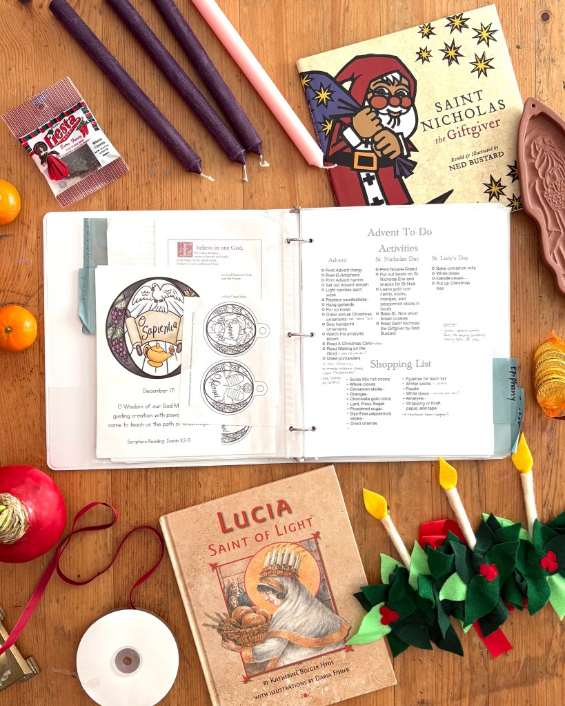 I keep a binder where I store all the recipes, craft tutorials, liturgies, Nicene Creed, or copies of pages from Advent books. This keeps me from scurrying about last minute trying to find that one receipt or what we are supposed to read on feast days.