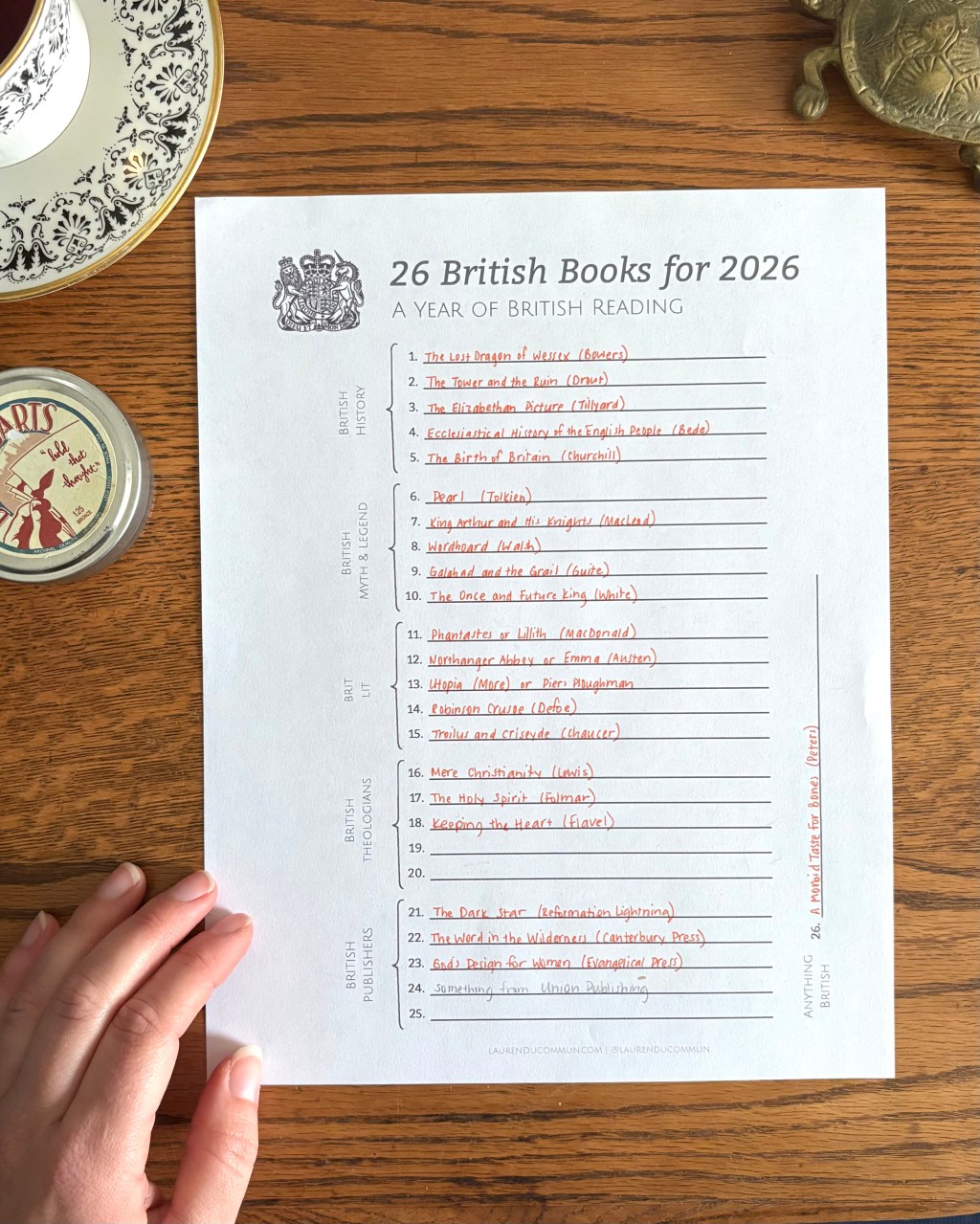 Perhaps you are both an Anglophile and a bibliophile and would like to join this British reading challenge! I’ve chosen five categories: British History, British Myths & Legends, Brit Lit, British Theologians, and British Publishers. You can download the reading challenge for free below! And tag me (@laurenducommun) on Instagram if you are participating!